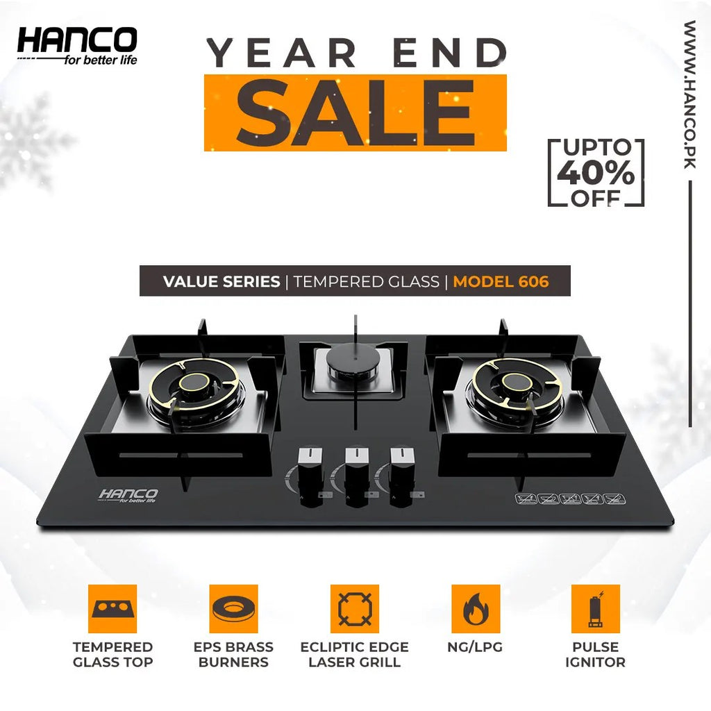 The Hanco HV-606EPS 3-Burner Value Series Tempered Glass Gas Hob offers a sleek, modern design with durable tempered glass in black. Featuring Ecliptic Edge Laser Grill for a stylish touch, this hob includes two large EPS burners and one semi-rapid burner to accommodate various cooking needs. The metal knobs allow easy control, while the flexible flame power ensures precise heat adjustment. The Pulse Ignitor adds convenience for quick ignition. Ideal for NG/LPG gas types, this gas hob is easy to clean, making it a functional and elegant addition to any kitchen.